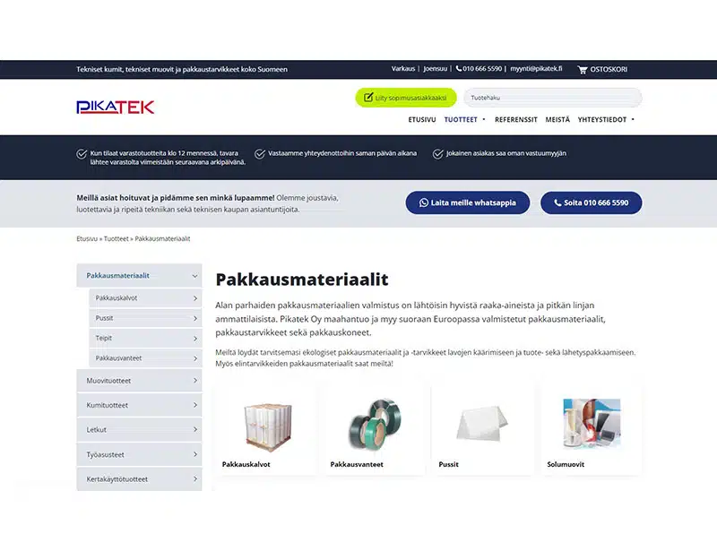 Pikatek Oy on monipuolinen ja joustava teknisen kaupan erikoisliike. Yritys tarjoaa asiakkailleen laajan valikoiman korkealaatuisia tuotteita kuten pakkausmateriaalit, kumi- ja muovituotteet, työasut, jalkineet, suojaimet ja kunnossapitotuotteet.